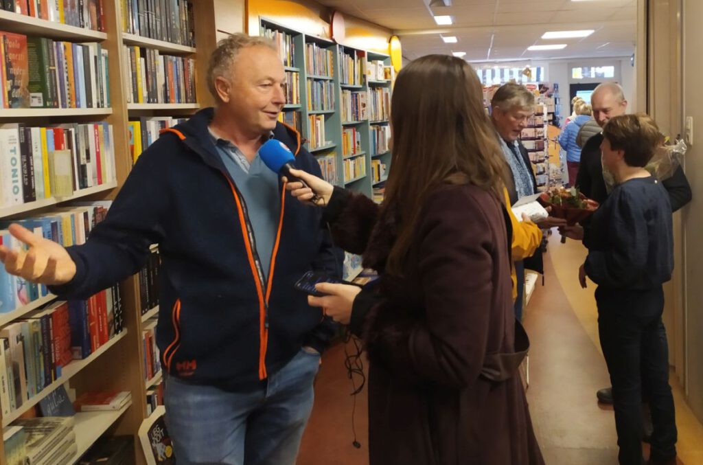 Het zou zo maar eens kunnen dat Boekhandel Muizelaar in Koudum de enige dorpsboekhandel in Friesland is, die in deze tijd de 100 jaar volmaakt, terwijl het bedrijf ononderbroken door leden van één familie is gedreven. Niet zo gek dus dat ook Omrop Fryslân afgelopen zaterdag op het feestje in de Koudumer boekwinkel aanwezig was. De Omrop interviewde niet alleen Jantje Muizelaar. Ook historicus Jan de Vries werd geïnterviewd die iets vertelde over de geschiedenis van de Koudumer middenstand en over de expositie ‘Een eeuw Koudumer middenstand’ die begin volgende jaar te zien is.