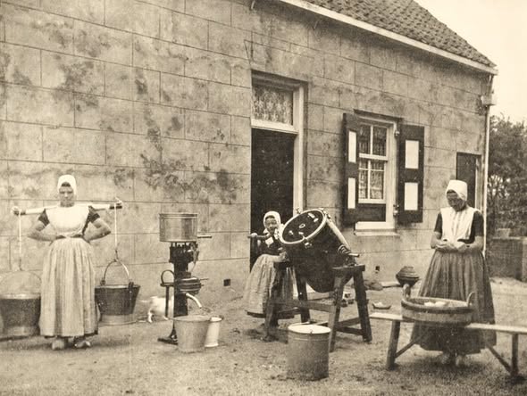Boterbereiding in Zeeland met behulp van een karnton, waarin ‘melk of room wordt omgeroerd, geklopt of geschud door een draaiende karnstok waardoor de vetbolletjes worden gescheiden van de vloeistof en men op deze manier boter verkrijgt’. (bron: https://www.encyclo.nl/begrip/karnton)