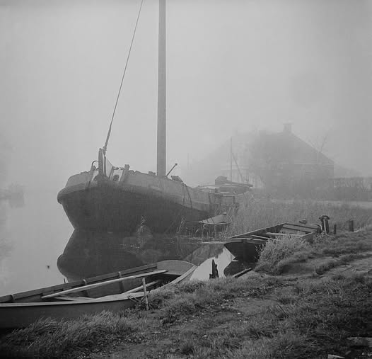 Een bijzondere historische afbeelding van een palingaak in de nevel bij Gaastmeer.