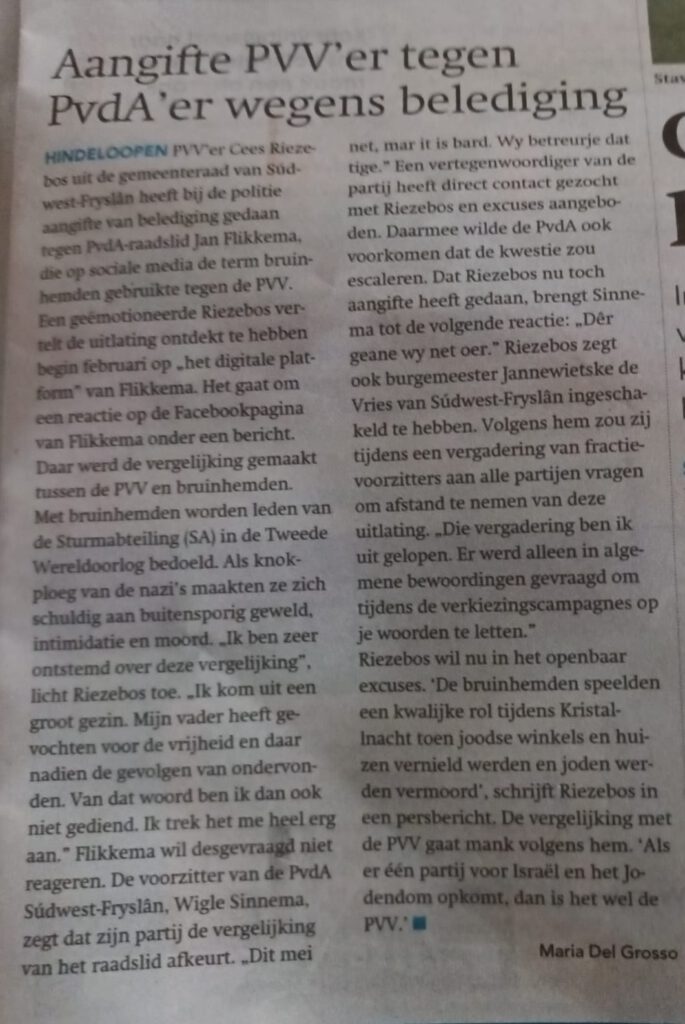PvdA-raadslid Jan Flikkema kwalificeerde op donderdag 29 januari 2026, op zijn eigen Facebookpagina, PVV-leden als bruinhemden. In de raadszaal van het Bestjoershûs aan de Sneker Marktstraat is een dergelijke uitlating nog nooit naar voren gebracht.