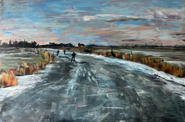 Het artistieke werk met schaatsers in een winters Fries landschap is klein van omvang, 40 cm bij 20 cm.