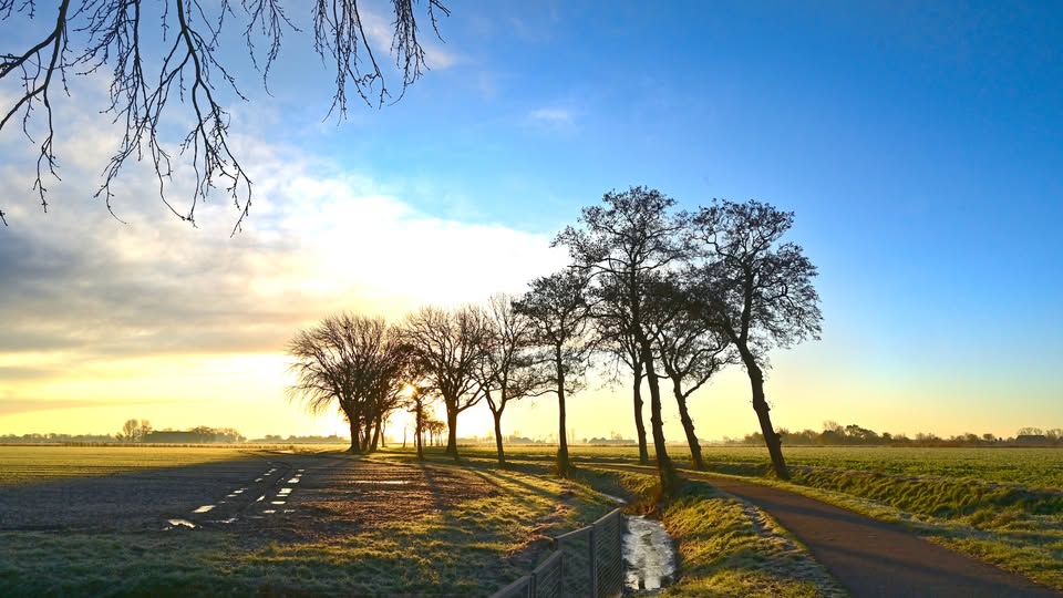 De fotografiecombinatie Aiso en Minke Lycklama A Nijeholt presenteert een landschappelijke beeldopname met tegenlicht van de Moeshornweg bij Uithuizen. WD