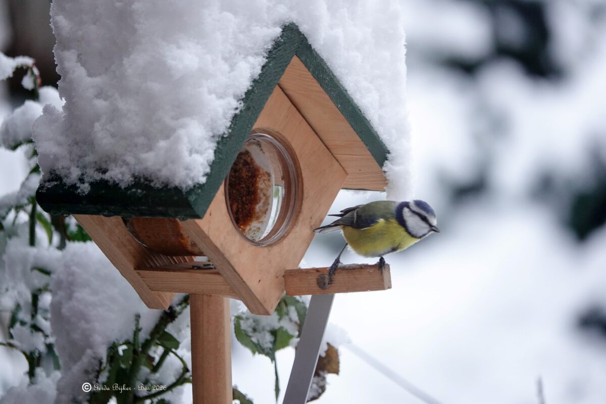 Fotograaf en vogelliefhebber Gerda Bijker presenteert een pimpelmees die een aarzelende houding toont om een ‘sneeuwvlucht’ te maken. WD