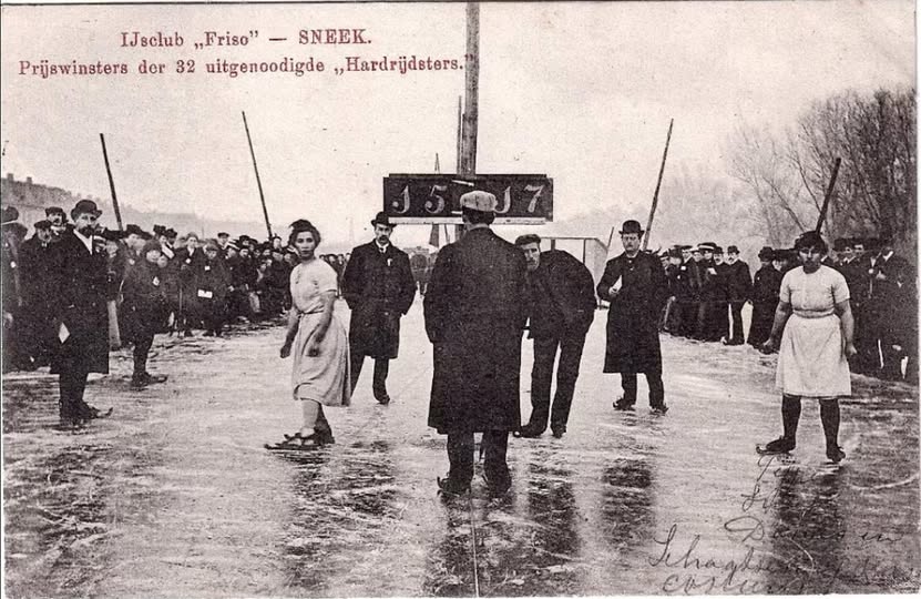 Een prachtige historische afbeelding van wedstrijdschaatsters in Sneek uit 1909. De kortebaanwedstrijd werd georganiseerd door ijsclub “Friso”. De ijsbaan was destijds gelegen achter de Geeuwkade en Stationsstraat op de plaats waar rond 1930 de veemarkt komt. De huidige toppers Femke Kok en Jutta Leerdam hadden robuuste voorgangers. WD
