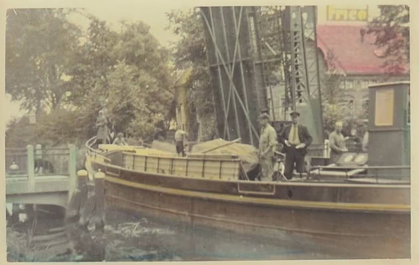 Een beurtschip staat op het punt de brug in de Zwette te passeren bij Scharnegoutum. De aanwezigen op het schip weten dat de fotograaf een beeldopname maakt. Decennialang in de vorige eeuw zorgden beurtschepen voor de aanvoer van goederen en brandstof, zoals kolen, door grote delen van Fryslân.