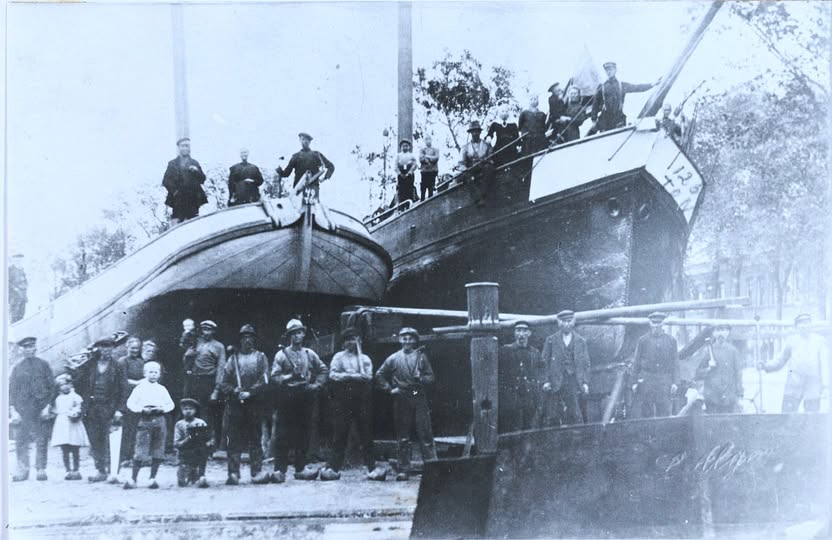 Een prachtige historische afbeelding, hoewel wat vaag aan de rechterzijde van twee schepen op de helling van de gleibakkerij in Bolsward. Het personeel staat op de schepen en de voorgrond. Door de aanwezigheid van wat jeugd krijgt de sociale waarde van de foto wat meer glans.