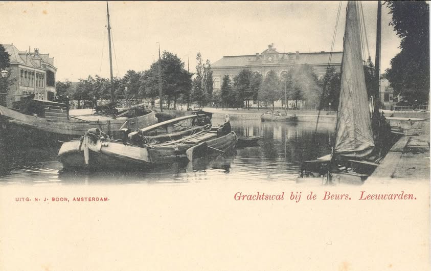 Een bijzondere historische afbeelding met schepen in de stadsgracht (Zuiderstadsgracht) voor de beurs in de Friese hoofdstad. Als u de beeldopname vergroot, ziet u een schippersvrouw aan het roer van het schip staan, waarachter nog een roeiboot of kleine vlet drijft. WD