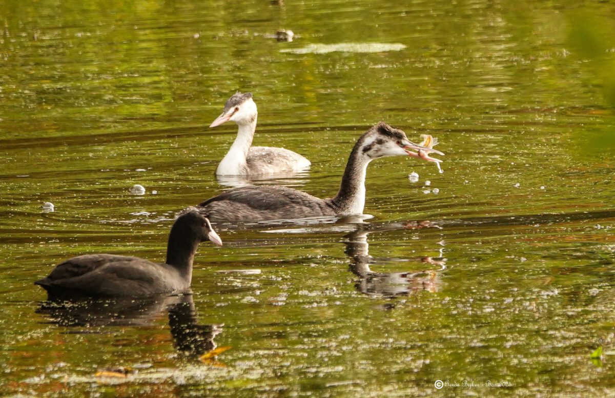 Gerda Bijker-Bos fotografeert een eenjarige fuut die lekker dooreet. Daarachter een eveneens jonge soortgenoot en daarvoor een meerkoet op het wateroppervlak. WD