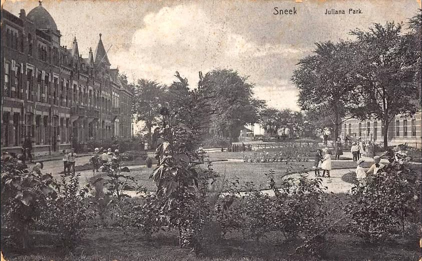 Een prachtige schilderachtige afbeelding van het Prinses Julianapark in de Friese Waterpoortstad. Aan de rechterkant woningen die in het begin van de twintigste eeuw werden gebouwd. Het park werd naar prinses Juliana vernoemd, toen zij in 1909 werd geboren. Het betreft een bijzonder cultuurhistorische locatie in Sneek, die zorg en toewijding verdient. WD