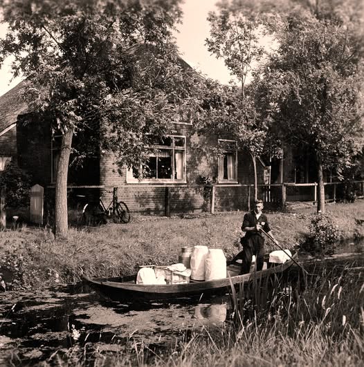 Een historische beeldopname met de melkboer aan huis en wel in het waterrijke Giethoorn van de jaren vijftig. Deze foto is ook terug te vinden op Facebookpagina Het oude boerenleven in Nederland.
