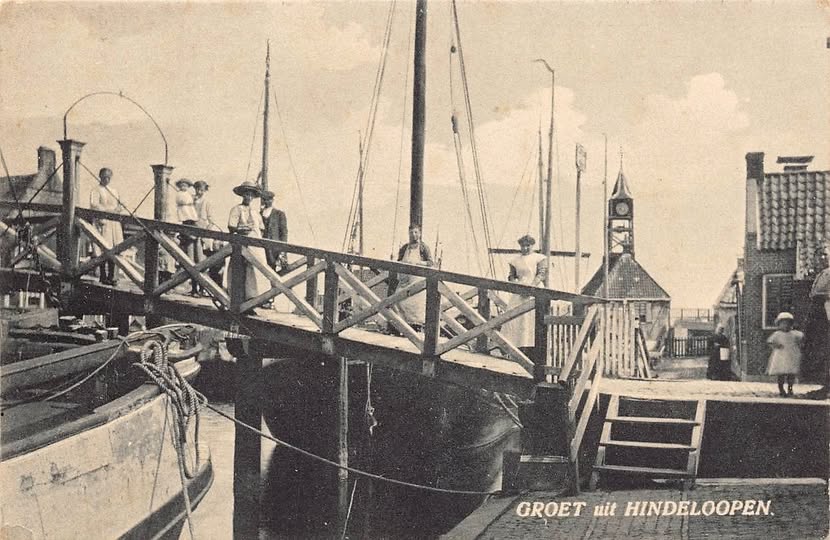 Een blik op Hindeloopen op een postkaart, toen er nog sprake was van de Zuiderzee. Het was zeer waarschijnlijk een zonnige dag, vanwege de zomerse hoed van een vrouw. Het gezicht van de aanwezigen is niet goed zichtbaar, maar het geheel is aardig om naar te kijken.
