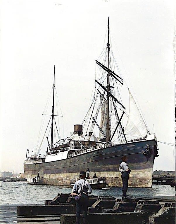 Authentieke historische beeldopname van de stadsgracht aan de Harinxmakade in Sneek. De foto dateert van ongeveer 1900. Links in het midden domineert de katholieke kerk. WD
