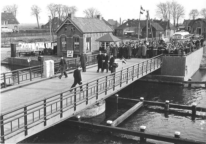 Een heldere en vrijwel zeker professionele beeldopname van de nieuwe brug in Warns over het Johan Willem Frisokanaal. De brug verbindt ’t Noard met de Noardermar, deze weg gaat richting Stavoren. Op de foto staan nogal wat heren met hoeden, waarvan velen uitgenodigd zijn. Opvallende elementen zijn verder de autobus, de was links in beeld, […]