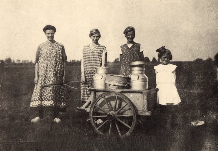 Een cultuurhistorische beeldbijdrage van drie vrouwen en een meisje die melken in de landerijen in de omtrek van Heino. De foto is terug te vinden op Facebookpagina Het oude boerenleven in Nederland.