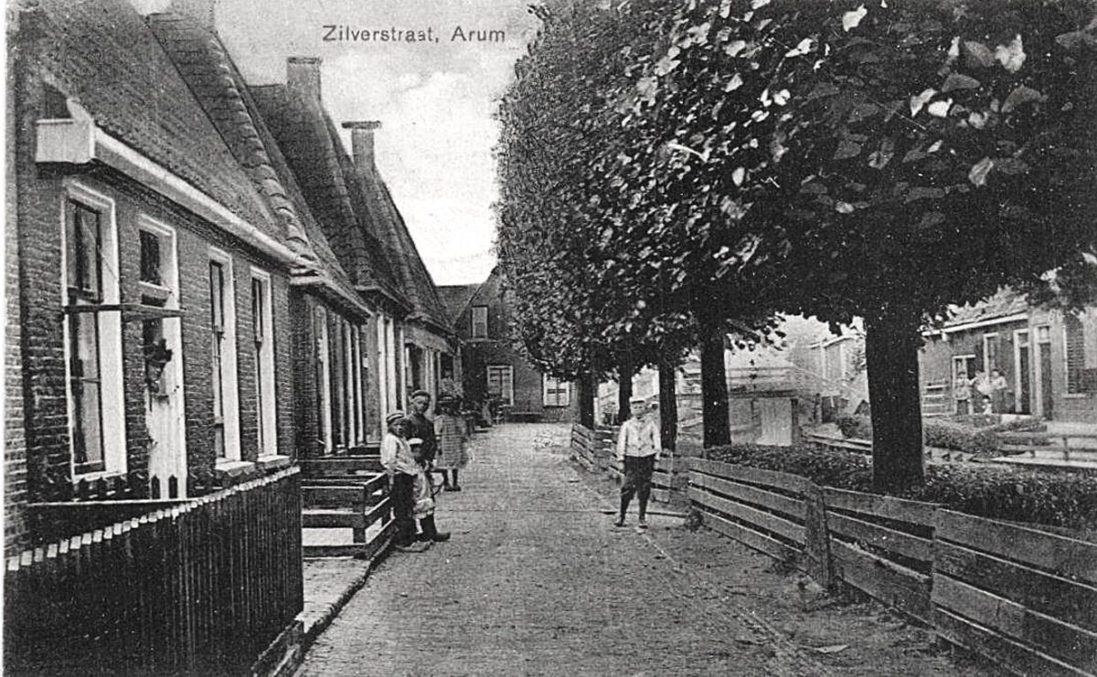 Een prachtige vooroorlogse foto van de Zilverstraat in Arum met arbeiderswoninkjes, wat jeugd en mooi groen. WD