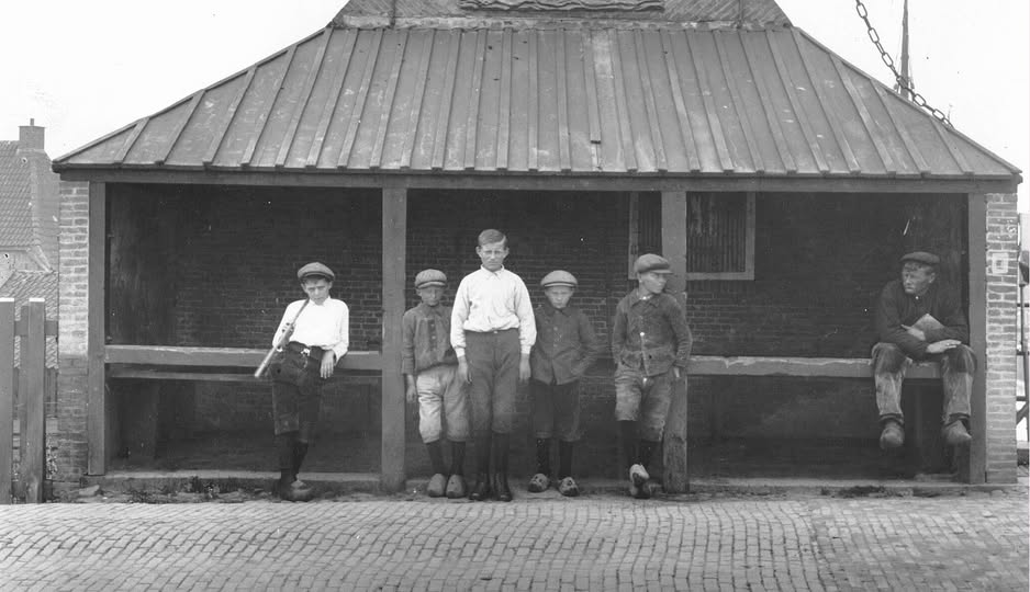 Een historische beeld van de leugenbank in Hindeloopen. Op deze dag dat de fotograaf langskwam waren het hoofdzakelijk jongens die onwaarheden vertellen. WD