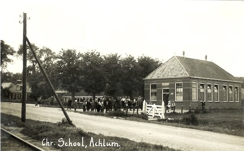 Een foto van de christelijke lagere school in Achlum, een mooi dorp in de Friese Greidhoeke. Als u een beetje op internet naar soortgelijke beeldopnames van scholen rondkijkt, komt u die veel tegen.
