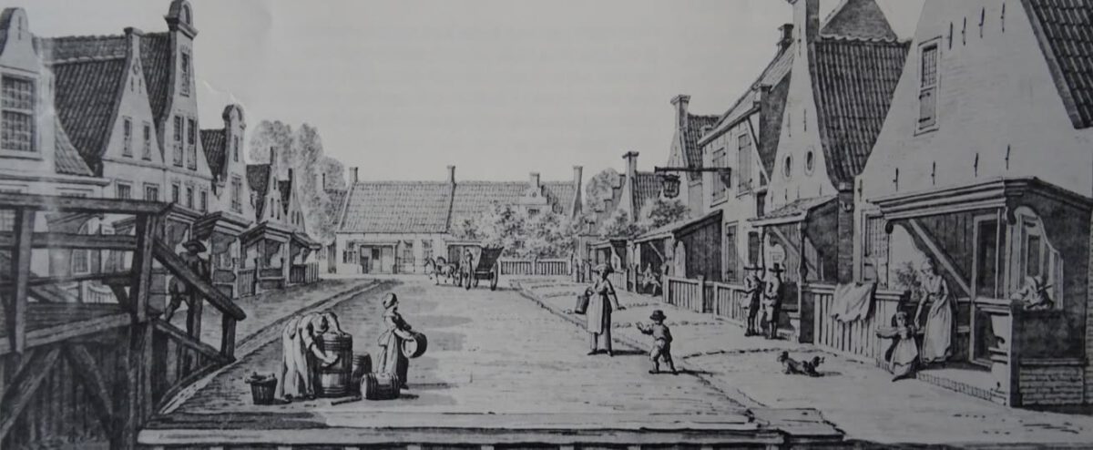 Dorpsgezicht van Arum naar een tekening van Jan Bulthuis, waarop valt te zien dat de huizen in de dorpen ook van luifels waren voorzien, aldus Berthus de Jong. Hij plaatste de afbeelding op genoemde Facebookpagina in het bijschrift.