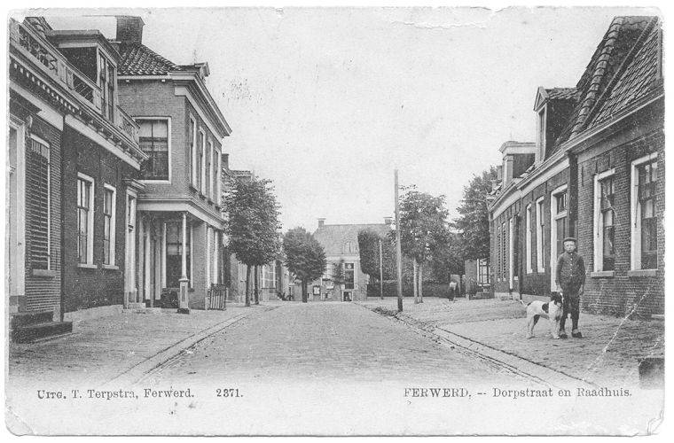 Uitgeverij T. Terpstra uit Ferwerd brengt een postkaart van het eigen dorp op de markt met daarop de dorpsstraat en het raadhuis. Rechts op de voorgrond staat bewoner P. Kroes met zijn hond.