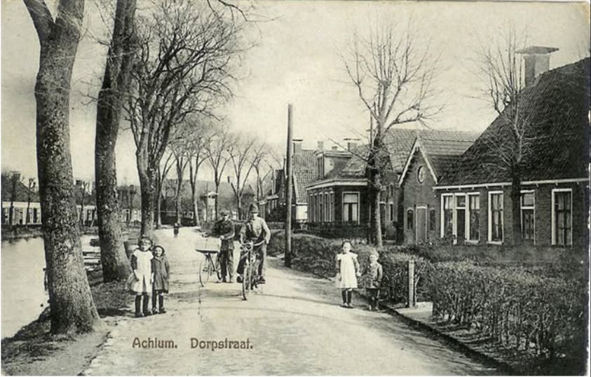 Een vage vooroorlogse beeldopname van de Dorpsstraat in Achlum. In het midden van de straat staan twee mannen met fietsen, zowel links en rechts staan twee kinderen die elkaars hand vasthouden. De hagen voor de woningen en de bomen aan de vaart zorgen voor een compleet beeld.