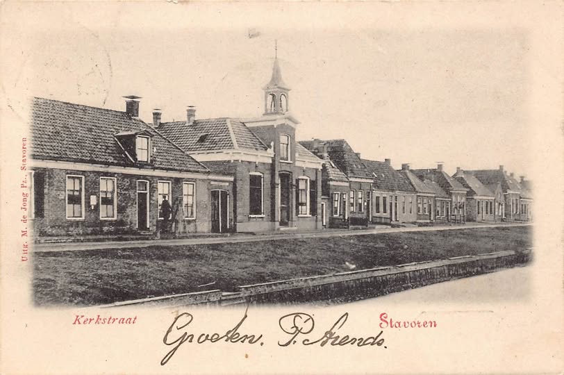 Een vooroorlogse afbeelding van de Kerkstraat in Stavoren en op de markt gebracht door uitgeverij M. de Jong uit deze havenplaats.