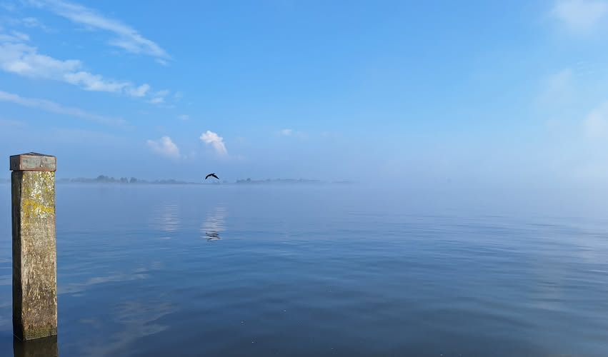Fotograaf Jeroen van der Kallen presenteert de sfeer op een stil meer. De meerpaal en de aalscholver vormen een passende aanvulling op deze mooie beeldopname.