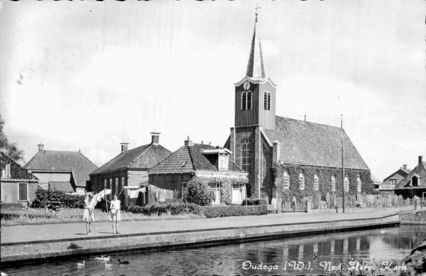 Een dorpsbeeld van Oudega (Wymbritseradeel) om een beetje bij weg te dromen in de goeie ouwe tijd. Op deze foto, tegelijk is het een postkaart, hangt de was buiten, vissen twee meisjes in de vaart, wordt de kerkmuur bedekt door gebladerte, staan grafzerken eeuwenlang rechtop en zwemmen eendjes tijdloos rond.