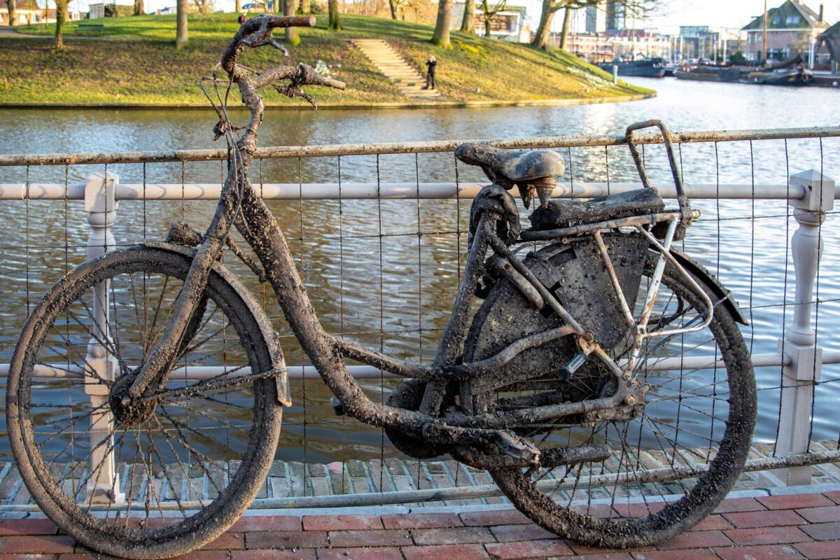 Fotograaf Floriske Gerritsma presenteert een vieze fiets, nadat deze uit de stadsgracht aan de Prinsentuin in Leeuwarden werd opgedregd.