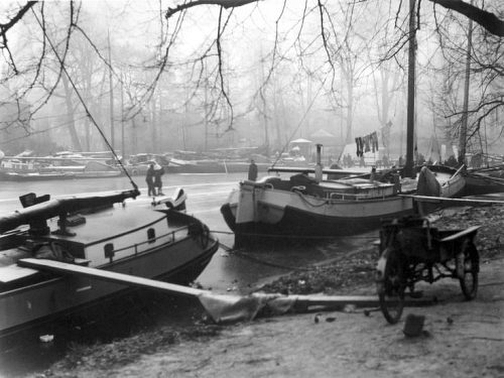Vastgevroren skûtsjes in de stadsgracht van Leeuwarden in 1939. Afbeelding werd geplaatst door Jacob Postma op Facebookpagina ‘Friesland in Oude & Nieuwe Foto’s’.