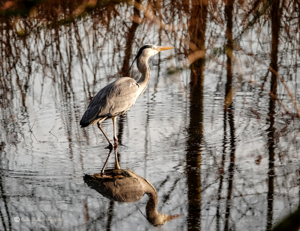 Blauwe reiger in spiegelbeeld. © Gerda Bijker