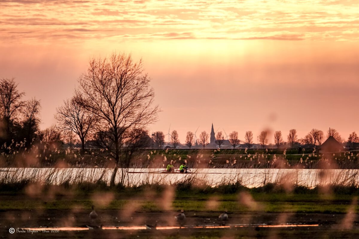 Fotograaf Gerda Bijker presenteert een gelaagde foto. Allereerst zijn onderaan de ganzen – vaag – zichtbaar aan de oever van de Geau, waarna op dit brede water twee sportievelingen in een roeiboot verschijnen.