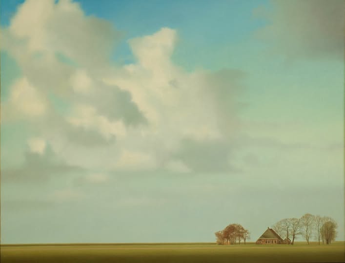 Kunstenaar Gerrit Wijngaarden uit Tjerkwerd presenteert ‘LANDSCHAP MET BOERDERIJ’, een schilderij zonder opsmuk.