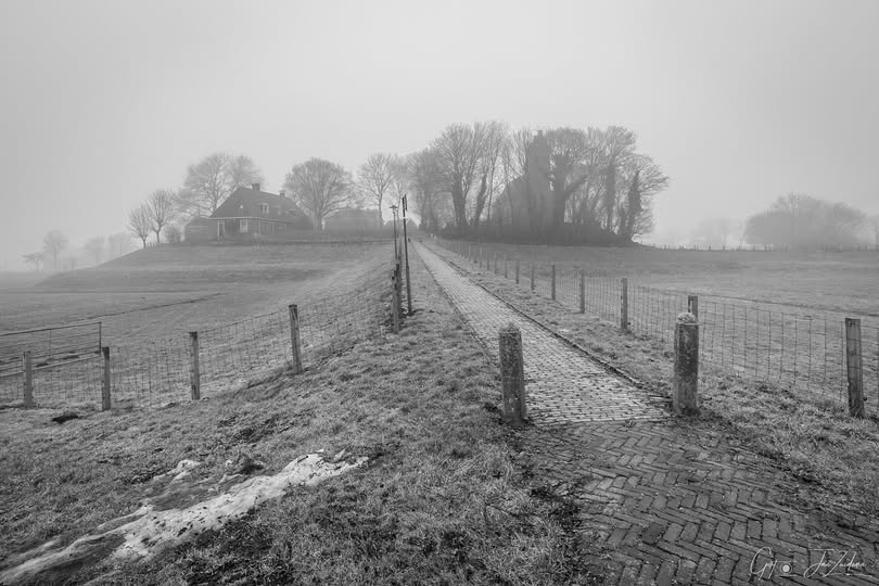 Fotograaf Gert Jan Zuidema presintearret de heechste terp fan Fryslân: Hegebeintum yn in grize sfear.