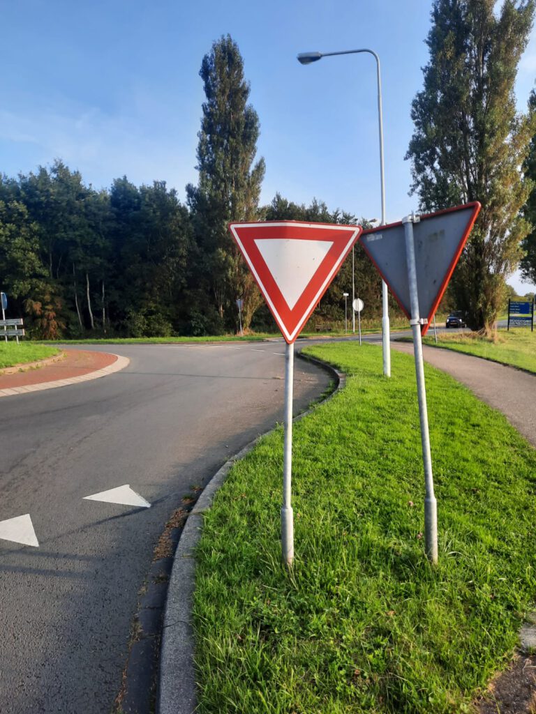Allereerst staan er rondom de rotonde op de locaties Lytshuzen en de Skatting bij Heeg zeven identieke verkeersborden, zoals hieronder fotografisch deels weergegeven. Het bord betekent: verleen voorrang aan de bestuurders op de kruisende weg. Tegelijk staan er haaientanden aan de rotonde. Op geen enkele manier wordt dus duidelijk waarom de bebording daar is aangebracht. Of heeft het college van Súdwest vergeten de borden laten weg te halen na verrichte werkzaamheden? Inmiddels zal de gemiddelde automobilist zijn neus ophalen.