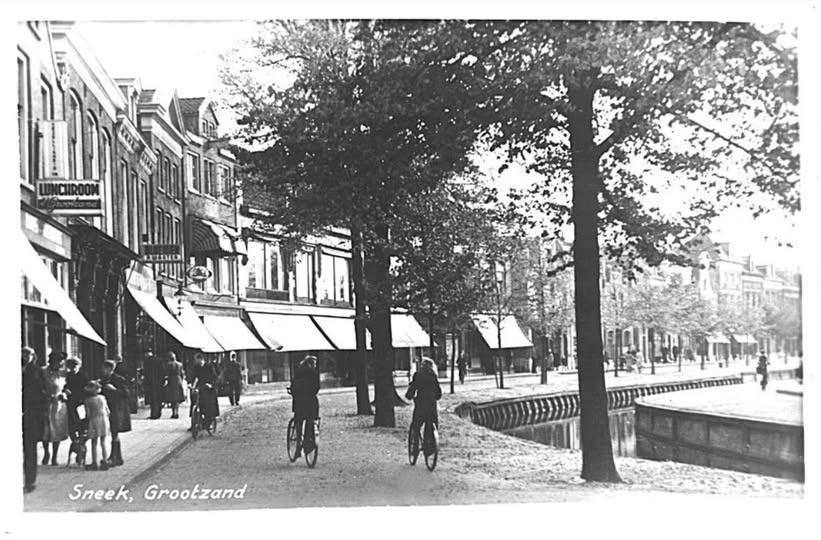 Zicht op het Grootzand in de Friese Waterpoortstad. Fietsers, winkelend publiek, bomen, zonneschermen en het water van deze winkelstraat kenmerken deze beeldopname. De foto is wellicht in de jaren vijftig of zestig van de vorige eeuw gemaakt.