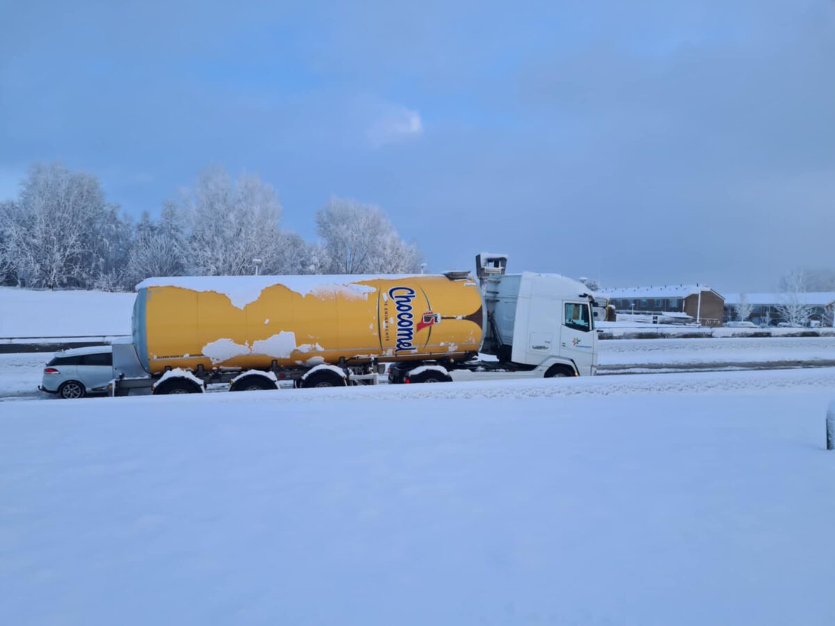 Fotograaf Reina Speelman presenteert een truck op de rondweg bij de wijk Tinga in Sneek, die vast komt te zitten in het dik gevallen pak sneeuw. Uiteindelijk slaagt de chauffeur erin met de truck los te komen. En dat is maar goed ook, want de jeugd die veel vertier heeft van het sneeuwballengooien, is daarna wel toe aan een kop warme chocomel.