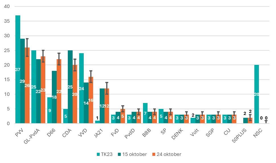 In de Ipsos I&O-zetelpeiling van 25 oktober 2025 groeien de grote partijen naar elkaar toe. PVV, GroenLinks-PvdA, D66 en CDA staan nu op maximaal zes zetels van elkaar. De PVV komt uit op 26 zetels (-3 zetels). Kiezers beseffen in toenemende mate dat het ingewikkeld wordt voor de PVV om deel uit te maken van de volgende coalitie en wijken daarom uit naar VVD en JA21.