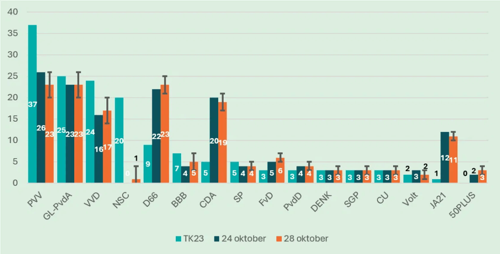 In de Ipsos I&O-zetelpeiling van 28 oktober 2025 komen drie partijen uit op 23 virtuele zetels: D66, GL-PvdA en PVV. Vlak daarna volgen CDA (19) en VVD (17). De enige significante verandering die optreedt sinds afgelopen weekend is dat de PVV wederom drie virtuele zetels inlevert. Er zijn nu vijf partijen die in theorie allemaal nog de grootste kunnen worden.