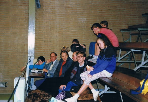 De lêste wedstriid wie meastentiids dy fan it sterkste learlingeteam tsjin de leararen, en ek ik haw dêr oan meidien, in foto bewiist it. Ik stean noch altiten fersteld fan mysels!
