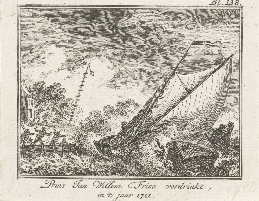 De koets fan’e prins waard op in platte skûte riden en by de oertocht bleaunen de prins en syn keamerhear Onno Boldewijn dy Tour yn’e koets sitten, it wie begûn te reinen en sa sieten se droech. De oaren fan it selskip bleaune gewoan bûten de koets stean of sitten, dat wie mar krekt wa’t in plakje fine koe. De platte skûte stiek oer nei de oare kant, se moasten nei Strijensas op’e Hollânske kust, mar flak foar dy kust krige de wyn fet op it seil, de skûte gong skean en ferfolgens rekken koets en ynsittenden yn it wetter. Sa as gewoan wie yn dy tiid koene de minsken net swemme, de prins hie ek nochris in boarstkuras oan en ja, hy en syn keamerhear ferdronken beide. In wike nei it drama waard it lyk fan’e prins fûn, flakby Strijensas, driuwkeljend yn’e reiden, sa’t der skreaun waard. Syn frou wie in pear moanne swier en as sy gjin soan krigen hie, hiene wy no Willem-Alexander net hân.
