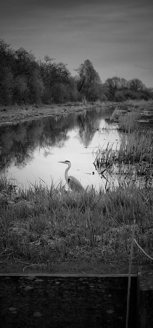 Het is alsof de reiger het zicht over het gehele beeld heeft en tegelijk niet opkijkt en omkijkt. In werkelijkheid wordt vanzelfsprekend naar een kikker of een vis uitgekeken.