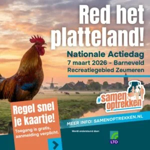 Op zaterdag 7 maart vindt de nationale actiedag Red het Platteland plaats. Een grote landelijke bijeenkomst waar burgers, boeren, vissers en ondernemers samen optrekken. Gezamenlijk vragen we aandacht voor het platteland: van onmisbaar belang voor behoud van ons landschap, voor voedselzekerheid, voor leefbaarheid en sociale samenhang. Ook LTO-voorzitter Ger Koopmans levert 7 maart een bijdrage aan deze manifestatie.
