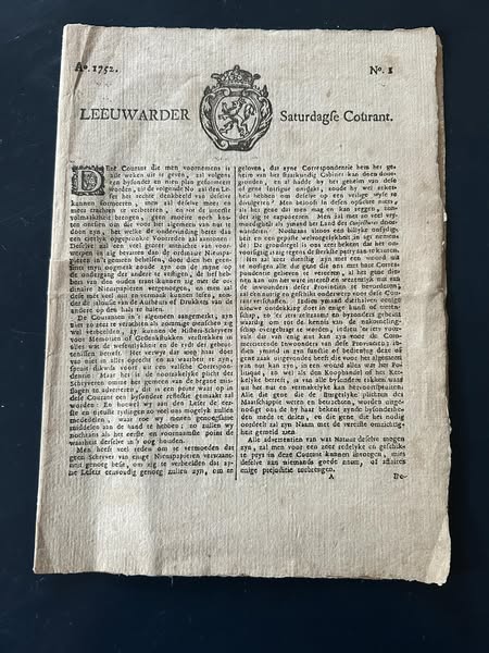 De earste Ljouwerter Krante wie ferskynd op 29 july 1752 en sadwaande hie tink ik Willem Sprenger, de direkteur fan’e Ljouwerter Krante yn 1902, it wol in leuk gebaar fûn om foar de abonnees fan 1902 in nei-printsel meitsje te litten fan dy earste krante, om dêrmei it 150-jierrich bestean fan’e krante wat kasjet te jaan. Dit nei-printsel is ek setten, it is gjin kopy, want dat koene se noch net, yn 1902, en om it noch echter lykje te litten hie Sprenger it setsel ek noch printsje litten op hânskept papier, it sjocht der sá echt út dat ek ik der yntuinde, en dat wol wat sizze, dat begripe jim wol. Der moatte wol in pear tûzen fan printe wêze…