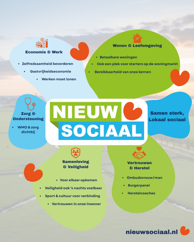 Ten aanzien van de zorg: Wij willen een gemeente die als bondgenoot naast de inwoner staat als het tegenzit, in plaats van als tegenstander. In de praktijk betekent dit: snellere ondersteuning, laagdrempelige zorg en plekken waar mensen elkaar fysiek kunnen ontmoeten.