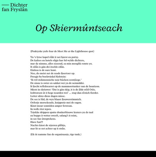 De expositie, een project van Boeken van Fryslân, werd geopend op 13 november, de eerste dag van het literaire festival ‘Meet Me At The Lighthouse’. Arjan Hut zegt in het artikel onder andere dat de expositie een manier is om Friese poëzie even op een andere manier te laten zien. Want, zo zegt hij, poëzie is al een niche, en Friese poëzie al helemaal.