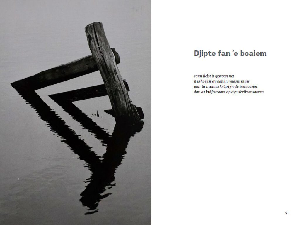 In dit geval van de vierde afdeling, ‘Djipte fan ‘e boaiem’ die uit één prozagedicht bestaat met een opvallende vorm. Op de zeven bladzijden van deze afdeling staat telkens één van de zeven strofen van tien volle regels midden op de bladzij. Het gedicht is een indringend, schrijnend zelfportret van een jongen van de boerderij die voor het eerst naar de middelbare school in de stad gaat, met alle angsten die daarmee gepaard gaan. Een bloedmooi gedicht, zoals de hele bundel prachtige gedichten bevat.