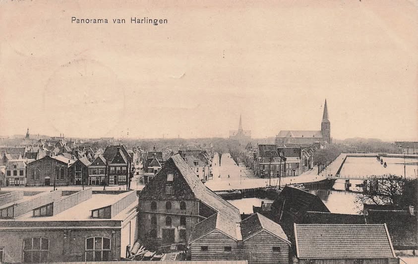 Een vroegere beeldopname van Harlingen, waar grotendeels het centrum van de havenstad op valt waar te nemen. Rechts springt de rooms-katholieke Sint-Michaëlkerk aan de Zuiderhaven in het oog, waar Alfred Tepe de bouwmeester van is.