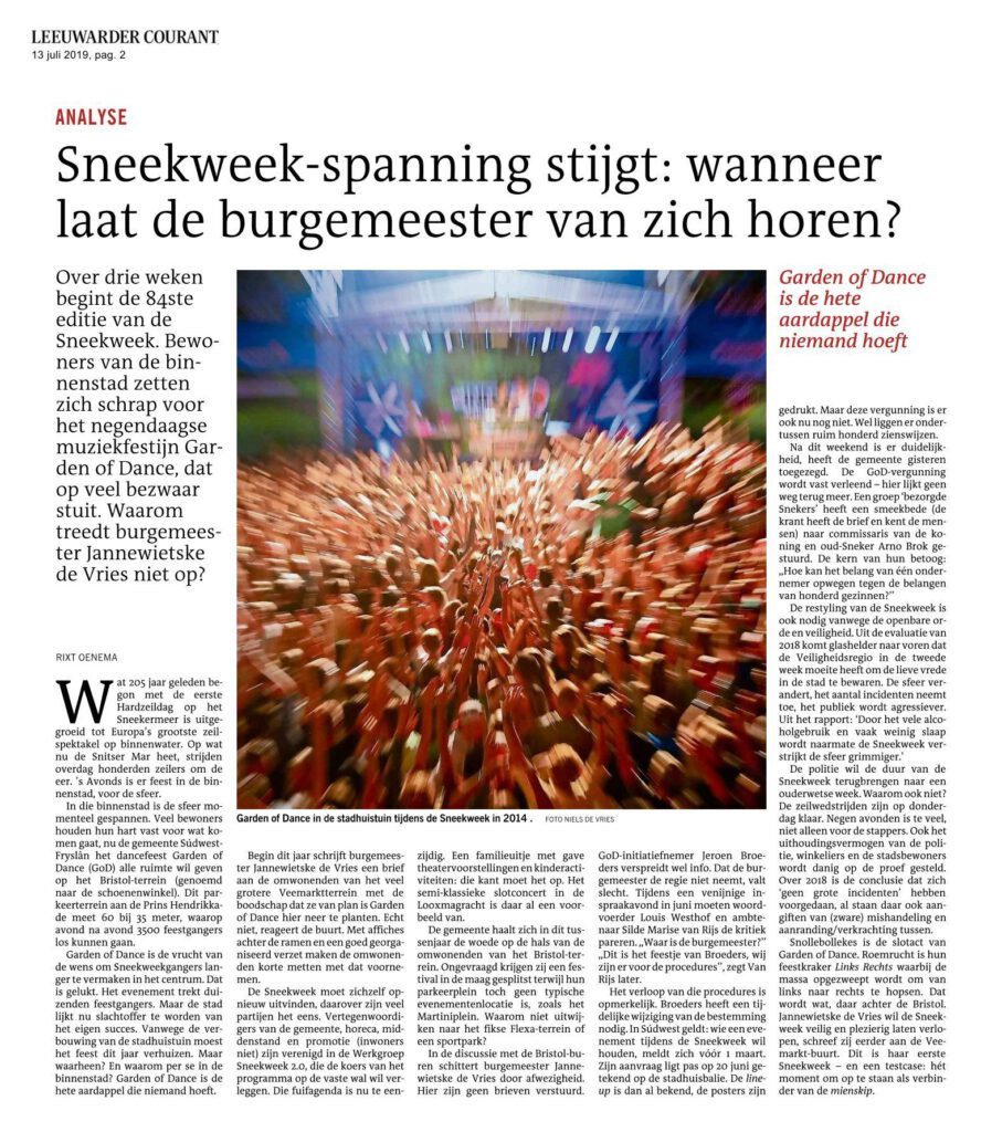 PvdA-burgemeester Jannewietske de Vries heeft nogal wat flaters op haar naam staan. In de zomer van 2019 geeft ze haar eerste bestuurlijke brevet van onvermogen aan de Snekers af ten aanzien van Garden of Dance, waaraan LC-journaliste Rixt Oenema een pittig artikel wijdt.