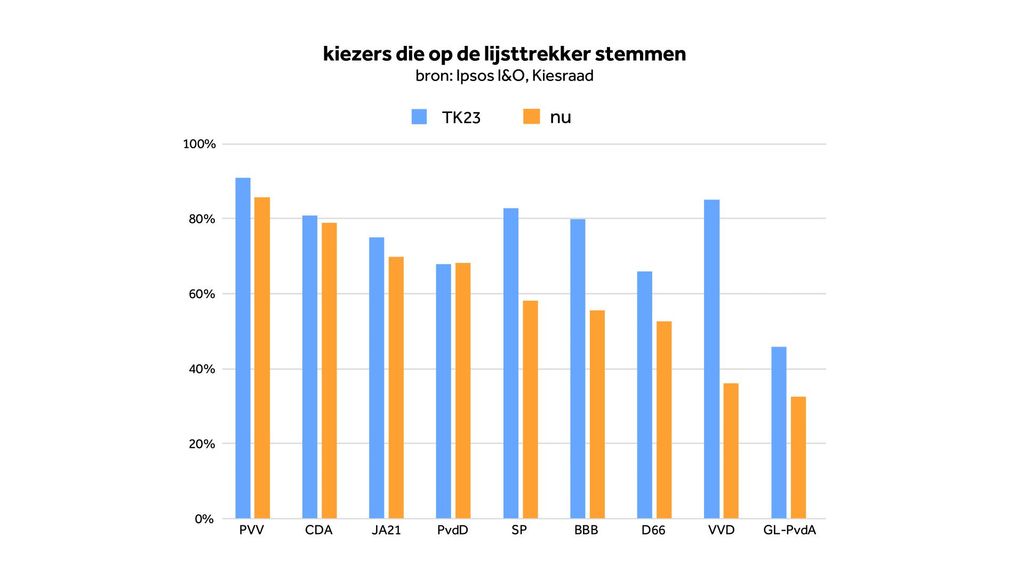 Ongeveer twee derde van de VVD- en GroenLinks-PvdA-stemmers is niet van plan om bij de aankomende verkiezingen op de lijsttrekker van die partij te stemmen. Dat blijkt uit onderzoek van Ipsos I&O in opdracht van Nieuwsuur.