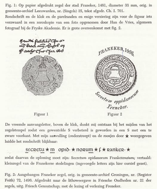 Anne Hallema is één v/d historici die dit echter ten stelligste bestrijdt. In zijn boek ‘Franeker door de eeuwen heen’ komt hij eerder uit op het jaar 1402, toen volgens hem Franeker min of meer een stad werd door het verwerven v/h marktrecht. Als aardigheid bijgaand uit het boek ‘Inventaris der archieven’ van mr. H.T. Obreen een afdruk + uitleg v/h 1e zegel der stad Franeker uit 1481, met ernaast nog één uit 1496: